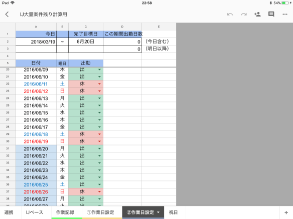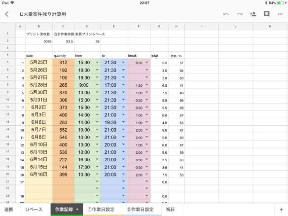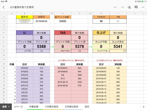 集計されてくると、1日のペースや1時間当たりの生産枚数も知りたくなり、完了目標を設定して、1日のノルマを出したりとシートを進化させていきました。