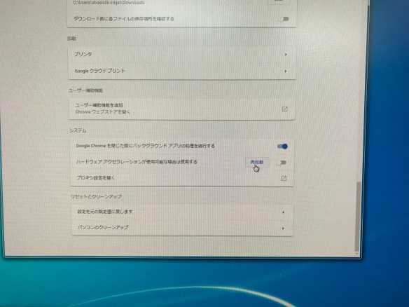 Chromeの「設定」から「詳細設定」→「システム」の「ハードウェアアクセラレーションが使用可能な場合は使用する」をオフにして再起動をクリック。