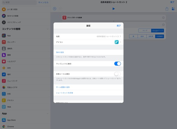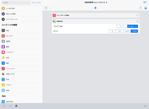 さすがに一発でとはいかないようで、タップすると自動的にショートカットアプリが表示され、続いて自動的にGoogleマップが起動し、地名を検索し、経路を検索して表示されます。体感的には2、3秒かかるので、なんとも言えない気持ちになりますが、考えてみると、マップアプリの検索窓にペーストして経路をタップするだけの2〜3タップを省略できているだけのことに気付きますが、