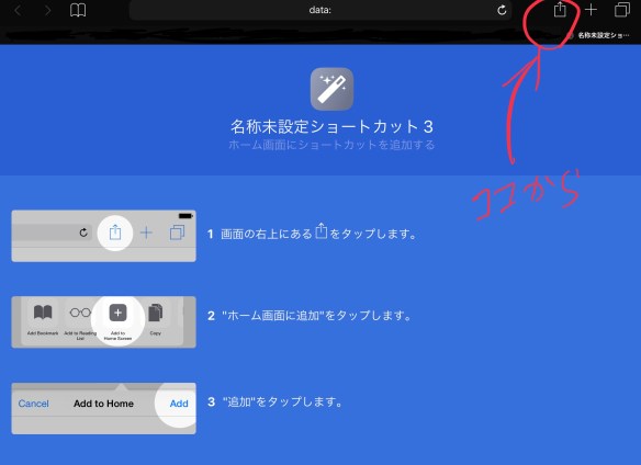 Safariの右上の展開マークから「ホーム画面に追加」を選択。