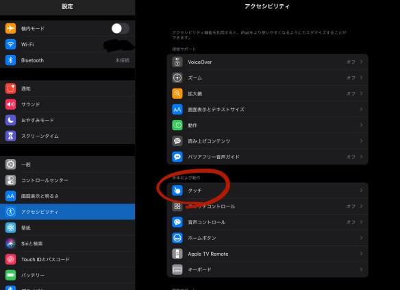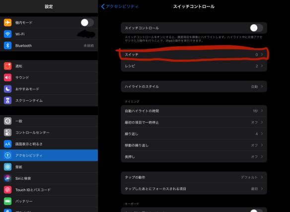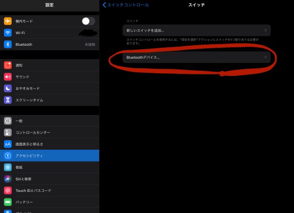 今調べたら、「設定」から同じ「アクセシビリティ」に進んで、「スイッチコントロール」からもBluetoothsの接続ができそうなんですよ。