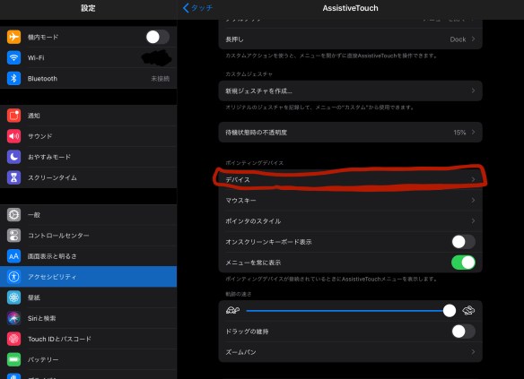 「設定」→「アクセシビリティ」→「タッチ」→「AssistiveTouch」→(ポインティングデバイス欄の)「デバイス」と進むと、