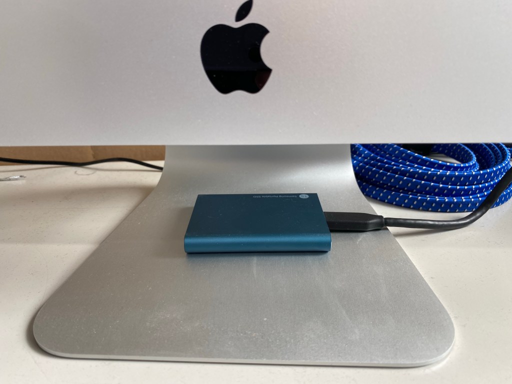 最下位機種でもUSB-C(Thunderbolt3)入力端子が装備されているところがMacの凄さですね。やろうと思えばThunderbolt3で外付けSSDにすればもっと高速になるわけで。据え置き型のiMacだし、持ち歩いたり、毎回抜き差しするわけじゃないので、外付けでもスピードが出るなら何の問題もないし。外付けSSD自体もすごく小さいし。