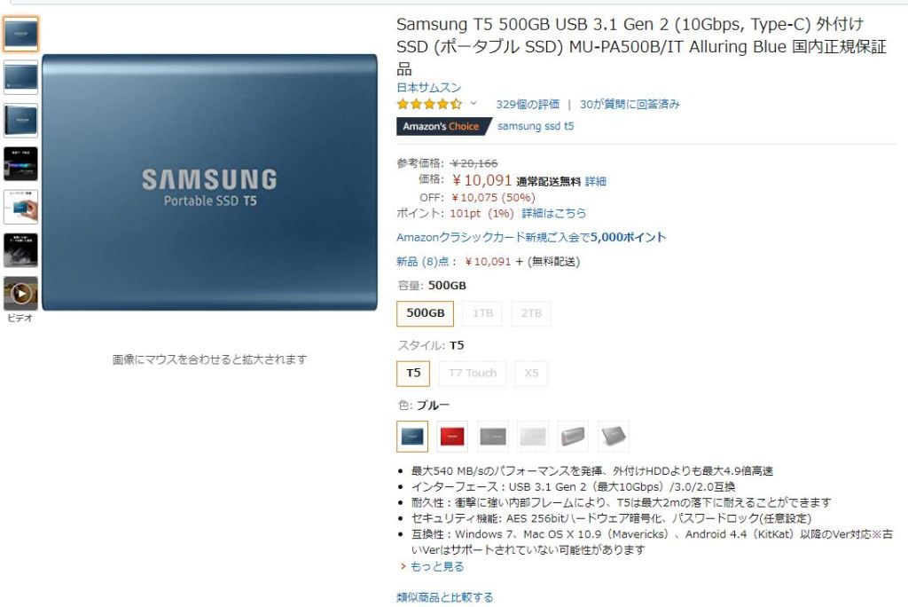 Thunderbolt3対応だとバカ高い(500Gで3万超え。。。)ので、USB-C対応のものにした。