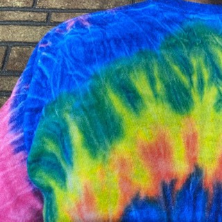 元画像に近く表現できている。もともとこのタイダイのTシャツは作業着として数年着ているので洗濯に洗濯を重ね、色褪せた部分が表現できている。ブルーに関しては、深く綺麗な発色。ブルーインクの効果。深く綺麗なブルーもCMYKだけでは表現が難しい。CMYKだけだと、深いブルーを表現するためにはシアンとマゼンタインクを大量に必要になるが、ブルーインクがあれば、一つのインクで表現ができ、インク量の削減に繋がる。