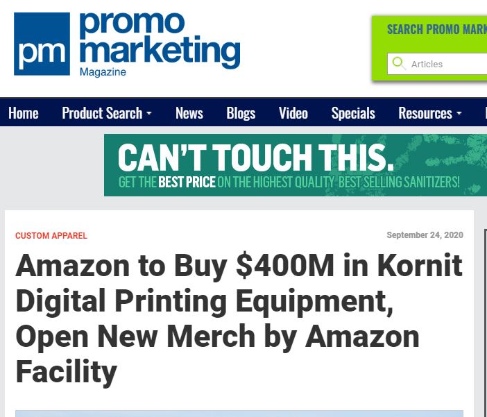 Amazonの新しいKornit契約は、もう1つの足がかりと見なすことができます。イスラエルの新聞Haaretzによると、Amazonは新しい機器を使用して、室内装飾品やベッドカバーなどの家庭用品、スポーツ用品、テキスタイルに拡大する予定です。