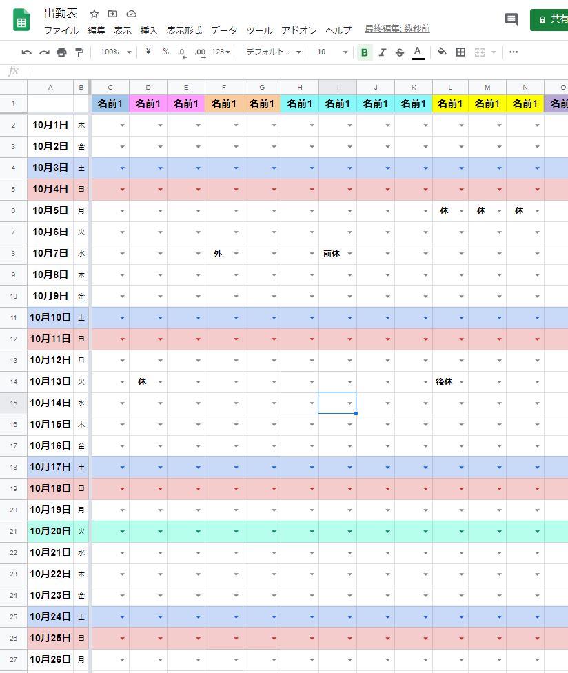 todayで本日の日付の行にも色がつくようにして視認性上げ、土日祝に定番の色をつけ、週単位の状況の把握をしやすくする。