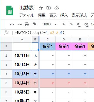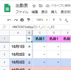 B1に(A2行から数えて)昨日の日付が入っている行までの行数が表示された。