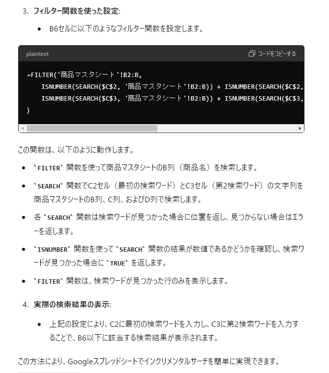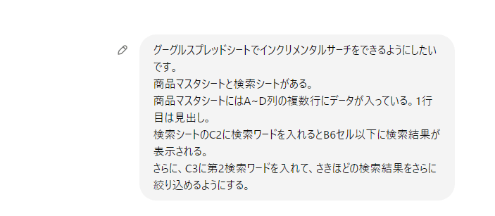 スプレッドシートに商品マスタのレコードをインポートして簡易データベースを作る。そして、そのデータベースに検索をかけてヒットさせる。検索は第1検索ワードで絞り込み、更に第2検索ワードで絞り込みたい。そもそもスプレッドシートでインクリメンタルサーチなんてできるのかな?QUERY関数とかを入れ子にするのかな?なんて想像しつつ、実現方法をGoogleで1分ほど検索したこところ、情報が見つからなかったので、すぐにChatGPTに相談。