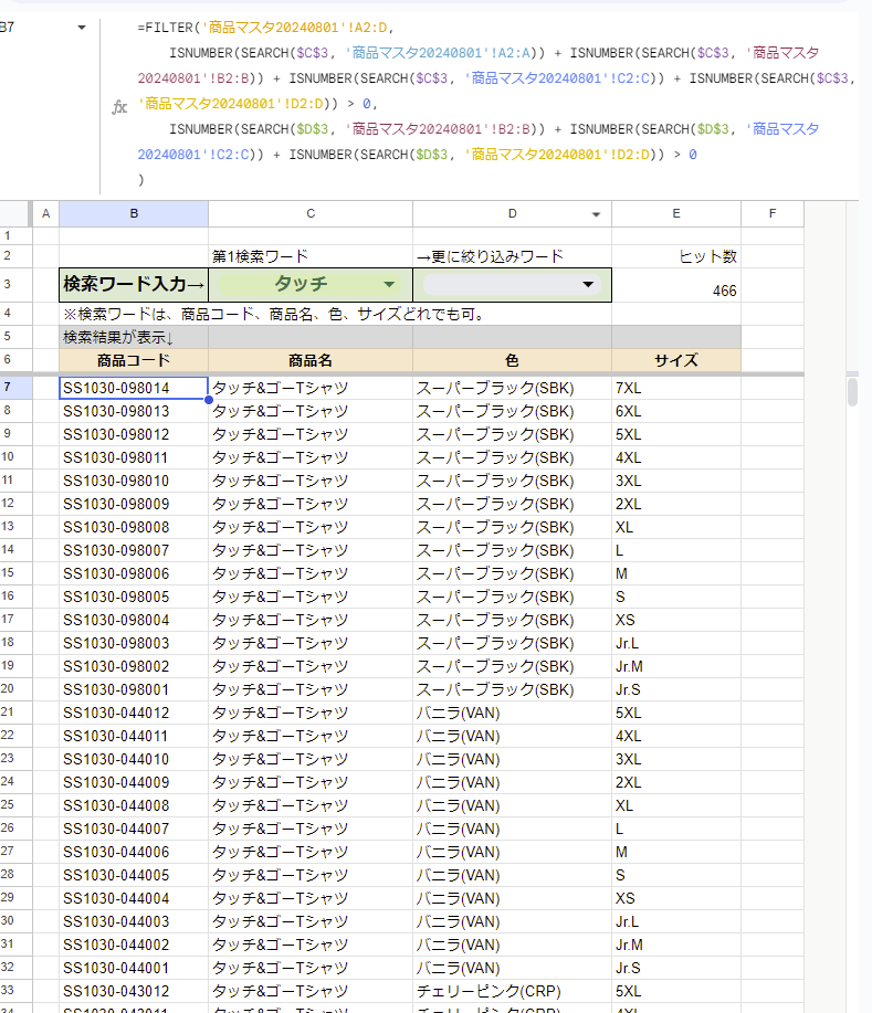 あとは、行の固定、検索ワード入力セルを横並びに、検索結果の行数をカウントしてヒット数を表示、、、などなど変更して見やすく整えて。。。。